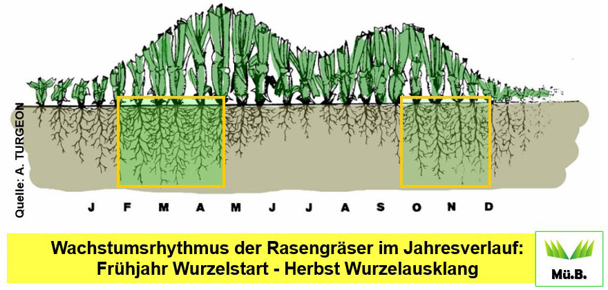 Eine zeitgerechte Förderung der Wurzelmasse vor dem Winter unterstützt die Phase der Wiederergrünung im zeitigen Frühjahr. Dies gilt sowohl für Rasentragschichten als auch für herkömmlich aufgebaute Sportplätze und Golf-Fairways. Vorbeugende Maßnahmen zur Vermeidung von Verdichtungen bei ungünstigen Witterungs-bedingungen (Feuchtigkeit) sind vorteilhaft, da sich geschädigte Böden nur sehr langsam (über Jahre) regenerieren können. Aktives Wurzelwachstum findet bis zum Herbst (Oktober) statt (s. Abbildung 2).