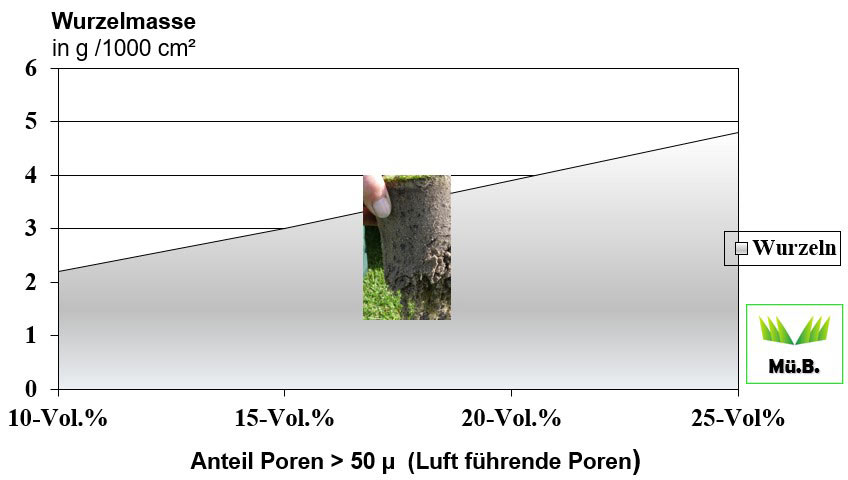 Damit die Wurzeln in tiefere Schichten vordringen können, darf der Boden nur bis zu einem bestimmten Grad verdichtet sein. Untersuchungen haben gezeigt, dass bei einem erhöhten Eindringwiderstand (gemessen mit dem Penetrometer) die Wurzeln nicht weiter in den Boden [nbsp]einwachsen, hier sorgt dann eine gezielte Tiefenlockerung für Abhilfe. Für die praktische Golf- und Sportplatzpflege bedeutet dies: