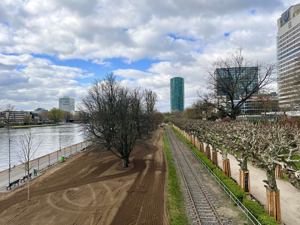 Auf etwa eineinhalb Kilometern bot die Fanmeile am Frankfurter Mainufer zur UEFA-Fußball-Europameisterschaft im Sommer 2024 30.000 Menschen Platz. An den darunterliegenden Rasenflächen hinterließen Freud und Leid der Fans jedoch deutliche Spuren: zahlreiche Aufbauten, Stände und Fan-Aktivitäten beanspruchten die Grünanlage im Herzen der Stadt stark.