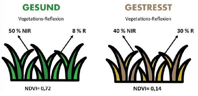 Eine gesunde Rasennarbe reflektiert im sichtbaren Spektralbereich (Wellenlänge 400 bis 700 nm) relativ wenig, im darauffolgenden Infrarot-Bereich (Wellenlänge 700 bis 1300 nm) dagegen relativ viel Strahlung. Je gesünder die Gräser sind, desto höher ist die Reflektion im Nahinfrarotbereich (NIR). Diese Verhältnisse lassen sich mit den geeigneten Messgeräten erfassen und für die Vitalitätsbestimmung nutzen.