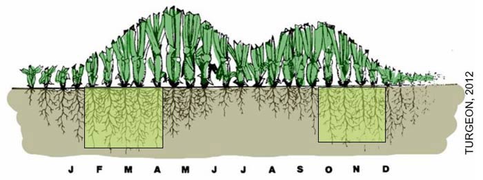 Da das Wachstum der Gräser mit der Wurzelentwicklung im Boden beginnt, nehmen viele Rasenbesitzer dieses Zeichen kaum wahr. Die schematische Darstellung der Wachstumskurve der Kaltzonen-Gräser nach TURGEON (2012), zeigt sowohl den oberirdischen Aufwuchs, als auch die unterirdische Wurzelausprägung im Jahresrhythmus. Die Kaltzonen-Gräser (cool season grasses) kommen in der Regel auf natürliche Weise aus ihrer Vegetationsruhe, sobald durch die Wachstumsfaktoren Temperatur, Lichtintensität und Feuchtigkeit die entsprechenden Reize ausgelöst werden. Im zeitigen Frühjahr lässt sich durch eine Wurzelprobe (Profilspaten) die zu erwartende Regenerationskraft des Rasens beurteilen, um dann geeignete Maßnahmen zur Unterstützung der Wiederergrünung einzuleiten.