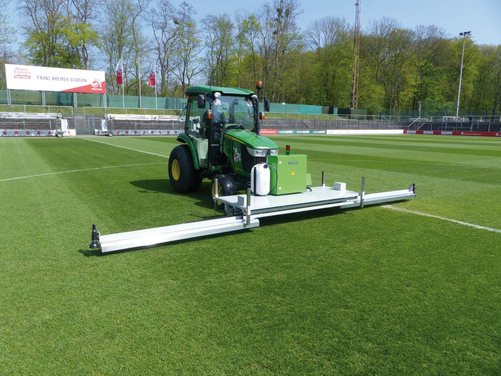 Für den sportplatztechnischen Einsatz stehen mobile und flexible Lösungen zur Verfügung. Ein Beispiel ist das Anbaugerät von Rhenac, das eine großflächige und zugleich präzise UVC-Behandlung im pflegerischen Alltag ermöglicht.